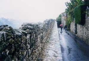 ブーゲンビリアやツタを絡ませ、石の壁とのコントラストが美しい。窓辺に飾られた花も町にとけ込む。 (8) 歴史のなごりの中で生活する 中世から現代へ。観光地としての風景。生活の場としての風景が混ざり合いながら、さらに、現在から21世紀へと引き継がれて行く。 ![]() 写真19 崩れかけた城壁 ![]() 写真20 大砲をかまえる。昔のなごり。 ![]() 写真21 城壁の外には、現在の家並みが広がる。 攻撃を意識しない現在の町並み (記録:三森和裕) |