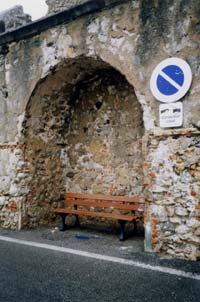 ![]() 写真6 海側から見た城壁とピカソ美術館 4 街角のベンチ 街を歩いていると、何気ないところにベンチが配置されていることに気づく。ちょっとした心遣いであるが、ベンチがあるだけで歩行者に安らぎを与え都市を豊かにするものである。 ![]() 写真7 城壁の中に組み込まれたベンチ |