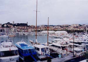 ![]() 写真2 ニースのホテル街と海岸通り ・朝の渋滞、側帯部分は自動車の駐車で一杯。 ![]() 写真3 透過性の高いバス停(シャレている) 2 カンヌ あのカンヌ映画祭で有名な国際的高級リゾート地に到着、旧港は豪華なヨットで一杯。帆先の林立で対岸の展望さえままならぬくらいだ。修理にいそしむ人々もおり、バカンスが終わって、今はヨットの休暇期間。 ![]() 写真4 旧港全景 |