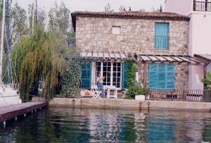 | 地中海沿岸特有の海浜リゾートとして余すことなく本領を発揮するのが、全ての家が海に面していることだ。海(水路)からこの家が見られ、家から海が見られる、これが開発の基本コンセプト。 まちの中心部には船着き場があり、遊覧船(ボート)にのると、30分ほどで全体を周遊できる。民家ふうの家が立ち並び、色彩も地中海的だ。また、水路に隔てられてまちに深みが加わるなど、ポールグリモーの良さは船からが一番わかる。 ![]() 写真15 遊覧船周遊コース ![]() 写真16 僕らの乗った船(ボート) ・車酔いの人と風邪気味の人は残念ながら下船 ![]() 写真17 船上コースの代表風景 |