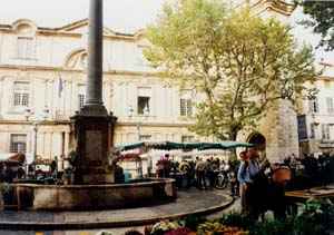 この絵はエクス・アン・プロヴァンスの全盛期にルイ王が描かせた物で、聖母マリアとその子の下にモーゼがおり、天使から神の言葉を聞いている。![]() 写真3 サン・ソヴァール大聖堂 4 エクス・アン・プロバンスの旧市街の景観 市役所の前の広場があり、そこには木曜日とあって花のマルシェ(市場)があり、市役所の周りにはこのような多目的広場とカフェがあり、生き生きとした町づくりがされていた。また、車道と広場の境には段差が無く、広々とした空間は車と人との共生の調和がとれた風景だった。日本の場合、役所(公的建築物)の前面の庭は役所の一部であり、境界がはっきりしている。行事のための広場だけで、市民の安らぎや集いの場では無いように思える。 ![]() 写真4 市役所前の花市場 |