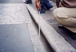 ![]() 写真9 巨大ハンプの確認状況 ○住宅地のポケットパーク 住宅の敷地の石張りと合わせて、広場も石張りとし、一体感を持たせて整備されている。宅地とポケットパークの境界に無意味な植樹をしないことにより、広場そのものも広く見せている。周辺との関係に配慮して計画することが大事である。(写真10・11) ![]() 写真10 住宅地のポケットパーク ![]() 写真11 民地と広場の関係 (記録:水田 雄) |