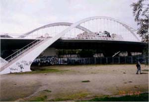 3 イカリア・アベニュー![]() 写真4 イカリア・アベニュー 1992年のバルセロナ・オリンピックの選手村として整備された地区にある通り。通りの真ん中に広い歩道。イスを置いたり、車道との境、白い照明柱などたくさんの工夫。 4 バック・デ・ローダのこ道橋 ![]() 写真5 白いスッキリした橋 著名な建築家カラトラバの作品。構造の合理性だけでなく、重力に逆らった張力とのバランス構造により、重くならないよう造られている。 5 インダストリアル・パーク ![]() 写真6 公園は水と緑が付きもの 工場跡地を再開発して造られた、サンツ駅西の公園。水面の占める割合が大きく、水際線がきれい。低いところにあるため、見やすい公園。 |