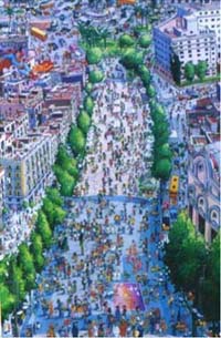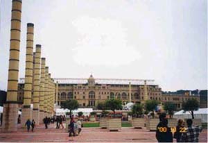6 ミース・ファン・デル・ローエ作パビリオン![]() 写真7 透過性のある建物 1929年の万博のドイツ館。前衛的なデザインが世界的に有名で1985年に再建された。 7 モンジュイックの丘オリンピックスタジアム ![]() 写真8 これがスタジアムの正面 万博で使用された建物の一部を残し、オリンピックスタジアムに改修。日本では古くなれば全て壊しゼロから作り直すが、ヨーロッパでは歴史を建物として残す。 8 ランブラス通り この歩道の広さには堀先生もびっくり。 人間中心を実感しました。 バルセロナ初日から天才ガウディに圧倒され、また、人間本位の丁寧な街づくりを見せてもらった一日でした。