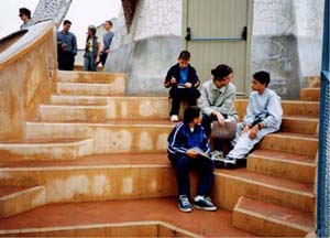 ![]() 写真12 屋上での課外授業 座りやすい階段の工夫。ちょっとしたことがもてなしとなる。子供達が自由にふれることが大事。日本は貴重な建物から閉め出してしまう。 ![]() ![]() 写真13 グラシア通の歩道タイル(左) カサ・ミラの床タイル (右) 左の歩道には何種類のタイルが使われているでしょうか。答えは、なんと1種類!! カサ・ミラでこのデザインのオリジナルを発見して感激、納得。ここでもガウディに脱帽。 ![]() 写真14 カサ・ミラから望むグラシア通 両側に側道がある。建物を使用する人は側道の両側に駐車できるので非常に便利である。 立派な街路樹は両側の建物があるからマッチしている。形でなく考え方を真似すべき。 |