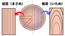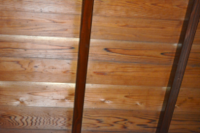 これはシモザシキの天井には木の年輪が見える切り方で切った板目か用いられているのに対し、カミザシキの天井は年輪が等間隔に並んだ直線のように柾目(マサメ)の板が使われています。 柾目材の方がきれいに見えることから使い分けて、部屋のかくを演出しています。