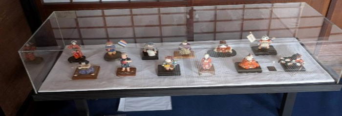五月人形は、応神天皇を抱く神功皇后・戦国武将の武田信玄と家臣団・りりしい顔立ちの騎馬武者人形など約20点が展示。 明治期に京都の老舗人形店で購入した品や、分家である、柏倉惣右衛門家からの祝いの品など来歴はさまざまという。