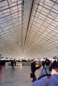 ROOMで出発直前まで原稿を執筆されていた堀先生の姿を見たのは私だけだったであろうか。これから先の行程を暗示するような風景ではあった。 定刻の12時ちょうどに車輪止めがはずされ(たような気がした。)、エールフランス275便は動き出した。12時25分離陸。途中気流の関係で何度か大きな揺れがあったこと、到着予定のFターミナルでなくCターミナルに到着したことを除けば、ほぼ予定どおりの11時間45分の飛行時間を経て、フランス時刻午後5時10分、機はパリ・シャルルドゴール空港に到着した。 実は、飛行機が予定どおり飛んだのはこれが最初で最後だった(これについては、後で。)。 ![]() 写真1 シャルルドゴール空港Fターミナル |