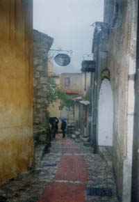 | 6 材質等による街の表情 様々なテクスチャーを持つ壁、舗装の石の黄色といろいろな茶色とが醸し出す複雑にからめるハーモニーが感動的である。 ![]() 写真6 街の表情 7 残念な事例 残念なことに、観光客が歩きやすいようにするためになのか、舗装の石畳が画一的な煉瓦に置き換わってしまっている。このために、すばらしい感動的な景観が壊されてしまっている。さらに、観光地化しすぎて、人が住んでいる気配もなくなり、新しく開店した店の看板も街の趣をなくしてしまっている。 ![]() 写真7 趣のない看板と舗装煉瓦 8 街の中の飾り付け 中世都市は道幅が一定でないため、広くなっているところ、引きがとれるところに植栽したり、花などで飾り付けをしている。 |