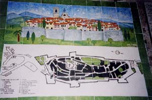サン・ポール・ド・ヴァンス バスは海岸を離れ、奥へ奥へと入っていく。起伏にある山並みの中に点在する家並み。まぶしい地中海のイメージはなく、なんとなく寂しい感じがつづく。突然、山の頂上付近に蜃気楼のように現れた町並み。石造りの建物がひしめき合う風景に驚かされた。 (1) 光に照らされる鷲の巣村 画家シャガールの描いたサン・ポール・ド・ヴァンス。中世の時代、一神教の世界においては、異民族はすべて皆殺しにされる。そのため、岩山をぐるりと城壁で囲みこみ、その中に町を造り、生活し、敵から身を守る工夫がされた。 ![]() 写真8 岩山の上に造り上げられた中世都市 (2) 鷲の巣村の基本の形 中心に教会、その周りに王宮、領主の館などを配置し、象徴やランドマークとするのが基本の形。 ![]() 写真9 サン・ポール・ド・ヴァンス配置図 (3) 19世紀の中頃までの中世都市 公園もなければ街路樹もなく壁1枚によって分けられるのが標準。 |