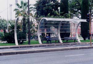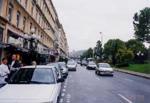 ![]() 写真2 ニースのホテル街と海岸通り ・朝の渋滞、側帯部分は自動車の駐車で一杯。 ![]() 写真3 透過性の高いバス停(シャレている) 2 カンヌ あのカンヌ映画祭で有名な国際的高級リゾート地に到着、旧港は豪華なヨットで一杯。帆先の林立で対岸の展望さえままならぬくらいだ。修理にいそしむ人々もおり、バカンスが終わって、今はヨットの休暇期間。 ![]() 写真4 旧港全景 |