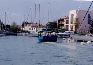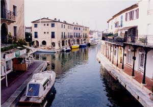 | 地中海沿岸特有の海浜リゾートとして余すことなく本領を発揮するのが、全ての家が海に面していることだ。海(水路)からこの家が見られ、家から海が見られる、これが開発の基本コンセプト。 まちの中心部には船着き場があり、遊覧船(ボート)にのると、30分ほどで全体を周遊できる。民家ふうの家が立ち並び、色彩も地中海的だ。また、水路に隔てられてまちに深みが加わるなど、ポールグリモーの良さは船からが一番わかる。 ![]() 写真15 遊覧船周遊コース ![]() 写真16 僕らの乗った船(ボート) ・車酔いの人と風邪気味の人は残念ながら下船 ![]() 写真17 船上コースの代表風景 |