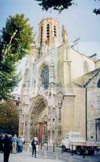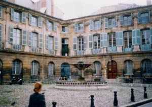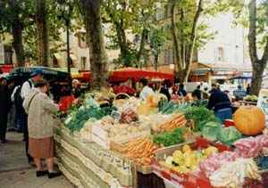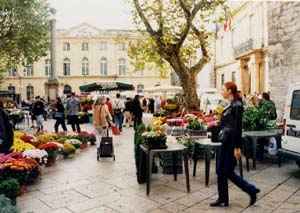 この絵はエクス・アン・プロヴァンスの全盛期にルイ王が描かせた物で、聖母マリアとその子の下にモーゼがおり、天使から神の言葉を聞いている。![]() 写真3 サン・ソヴァール大聖堂 4 エクス・アン・プロバンスの旧市街の景観 市役所の前の広場があり、そこには木曜日とあって花のマルシェ(市場)があり、市役所の周りにはこのような多目的広場とカフェがあり、生き生きとした町づくりがされていた。また、車道と広場の境には段差が無く、広々とした空間は車と人との共生の調和がとれた風景だった。日本の場合、役所(公的建築物)の前面の庭は役所の一部であり、境界がはっきりしている。行事のための広場だけで、市民の安らぎや集いの場では無いように思える。 ![]() 写真4 市役所前の花市場 |
