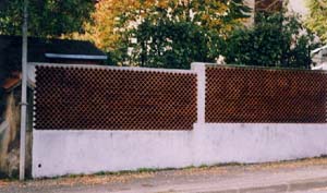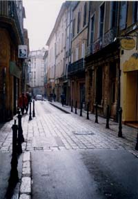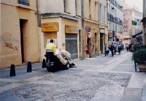 道路と歩道の境にガードレールが無く人の行き来を妨げていない、また、車道には車のスピードが上がらないようにハンプが設けてある。![]() 写真8 旧市街の道路 お金をかけずにワンポイント的にいれた石畳、 マニュアルにとらわれない設計者の工夫が見える。 ![]() 写真9 商店街の道 5 エクス・アン・プロバンスの新市街の景観 モナコでも観られたように、お金をかけず、住宅の外壁に屋根の瓦を重ね、風通しを良くし、色合いを旧市街にあわせている。ただ、基礎部がコンクリートでできていたため、もう一工夫あれば良かった。(民家では財政的に無理な話なのか?) |