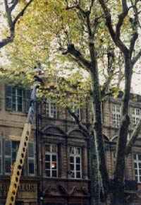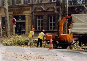 | 街の顔が出来ているため、街を理解するのが非常に簡単になり、訪れた人が自由に、安心して散策できることになる。 巨木に覆われた道路景観は、雪の多い山形では、なかなか味わえない、楽しい雰囲気が満ちていた。(写真3・4・5) ![]() 写真4 プラタナスの並木道と噴水 ![]() 写真5 片側2列のプラタナスの並木道 また、この日はたまたま街路樹の剪定場面に遭遇した。太い枝から無駄に上に伸びた細い枝だけを剪定し、その傍らで機械を使い、チップにして処理していた。日本によく見られる鉛筆みたいな剪定ではないので、次の年もボリューム感のある緑を楽しむことができる。道路の落ち葉の処理の維持管理を考慮して、落葉の間近いこの次期に剪定しているのであろうか。(写真6・7) ○巨大ハンプ 高さ25p、スロープ3.5m、天端2mの巨大ハンプ。勾配が思ったほど急ではないこと、天端の幅が比較的大きいことにより、運転者に与えるプレッシャーが見た目ほどでないためか、自動車の減速の割合がさほどでないような気がした。 |