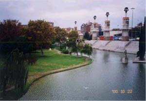 3 イカリア・アベニュー![]() 写真4 イカリア・アベニュー 1992年のバルセロナ・オリンピックの選手村として整備された地区にある通り。通りの真ん中に広い歩道。イスを置いたり、車道との境、白い照明柱などたくさんの工夫。 4 バック・デ・ローダのこ道橋 ![]() 写真5 白いスッキリした橋 著名な建築家カラトラバの作品。構造の合理性だけでなく、重力に逆らった張力とのバランス構造により、重くならないよう造られている。 5 インダストリアル・パーク ![]() 写真6 公園は水と緑が付きもの 工場跡地を再開発して造られた、サンツ駅西の公園。水面の占める割合が大きく、水際線がきれい。低いところにあるため、見やすい公園。 |