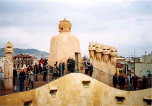 観光客が多く、大人も子供も楽しめる。各戸からの煙突のデザインが面白い。ガウディがの建物を設計するうえで、一番楽しんだ部分であろう。約100年後、こんなに見学者が多いと予想しただろうか。 |