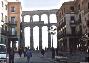5 水道橋 (Aqueducto Romano)![]() 写真5 ローマ水道橋 街づくりの中心をなし二千年前に築かれた。地域の景観の中で古代ローマ以来の記憶と受け継がれた土地の記憶を生かしている。 ![]() 写真6 豊かな空間 6 電柱は当然にない 歩く街というのは、みんなが、さりげなくいろいろな物を見ていく。だから、見られることを意識してデザインをがんばっている。電柱等じゃまするものがないので、広々とした豊かな空間の中で街の歴史と景観を実感できる。 7 水道橋と駐車場の共存 ![]() 写真7 駐車場 無味乾燥になりがちな駐車場を水道橋と同じような作りの壁で視界から遮断している。左が水道橋、右側の壁の裏が駐車場になっている。 |