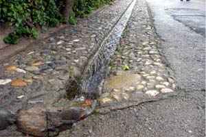 宮殿を様々な角度から望むことができる視点場は充分楽しめて寛ぎ感の持てるように整備され、景観先進地としての誇りが覗える。また、この場所は夜はライトアップされている。 A 街の景観整備 この地の特有な景観の原点には歴史的な背景が色濃く残され、現在の歴史的位置付けを明確に景観に留めるよう配慮されている。 ア.歴史上大切な建物等は、現在の生活・社会の変化に対応しながら保存、再利用されている。 ![]() 写真3 ローマ時代の水道橋 ![]() 写真4 歩道の石畳 ![]() 写真5 道路脇の側溝 |