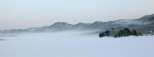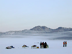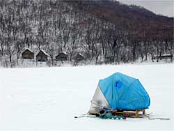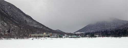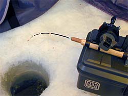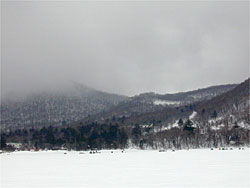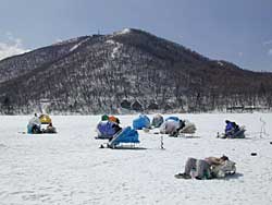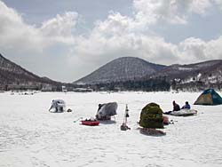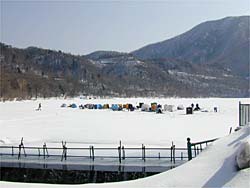 赤城大沼に5時半集合し、修行が始まりました。ポイントは塩原前で氷厚は1m近く、一つの穴を開けて力尽きてしまいました。水深4.6m。バンディ塩原さんお世話になりました。