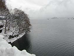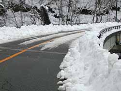 雪の状態は道幅が狭くなり、路面凍結していますので朝は気をつけてください。※写真は夕方3時半頃ですので凍結していません。