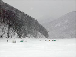 G目黒さんから、モービルで現場に入りましたが、渓流も始まり釣行している人はかなり減りましたね。氷は、雪も入れて60cm近くありまだまだ大丈夫ですね。