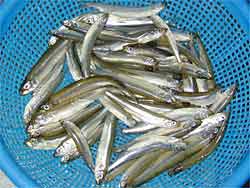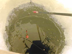 ラインは0.6・仕掛けはワカサギ針2号。4本に底バリ。ハリスはフロロ0.4、枝は1.5-2cm、オモリはS。エサは、噂の疑似餌と紅サシ。水深4.9m。棚は底です。