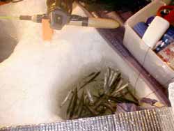 釣ったワカサギは生け簀を作ってそのまま入れます。これだと傷まないので、家まで生きたまま持ち帰ることも可能。取り込みが早くなるのでお薦めです。
