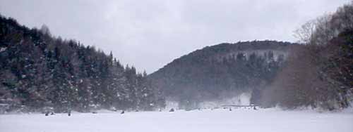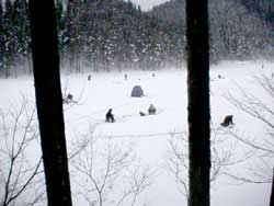 氷の厚さも40センチ(硬い氷10センチの上に柔らかい氷30センチ)と雪10センチとよいコンデションです。テント釣りは4張りほどで、泊まりは3張りでしたね。