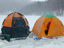 写真はpacoさんのワカサギテントと私のテント。同じ4人用ですが床が4角形と6角形の違いがあります。向こうの方が軽くて持ち運ぶのにいい感じ。