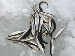 今回は、ダイワ棚ハンター改のテストを兼ねての釣行でしたが、ラインがガンガン繰り出していい感じでした。水深5.0m。エサは赤・白サシの半切りでラインは、PE0.4、オモリSS、ワカサギ2号針、ハリスはフロロ0.4、枝は2.5cm。仕掛け長は30センチに5本針(底バリ含む)でした。 |