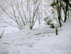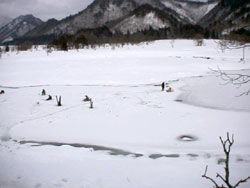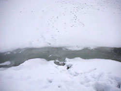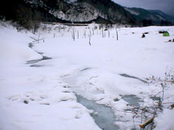 なんと、国道に近い方の降り口は、岸から融けてしまい渡れませんでした。(片足を踏み抜き、長めの長靴であったことに感謝です!)。。。