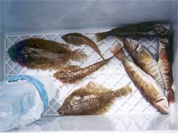アイナメが4匹、メゴチ(ネズミゴチ)2匹、ヒラメ1匹でした。(写真には、カレイが1匹混じっています)