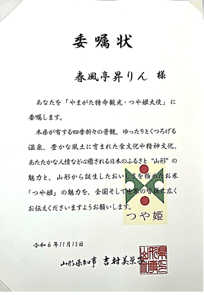 「やまがた特命観光・つや姫大使」委嘱状